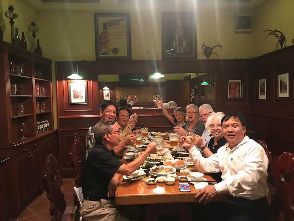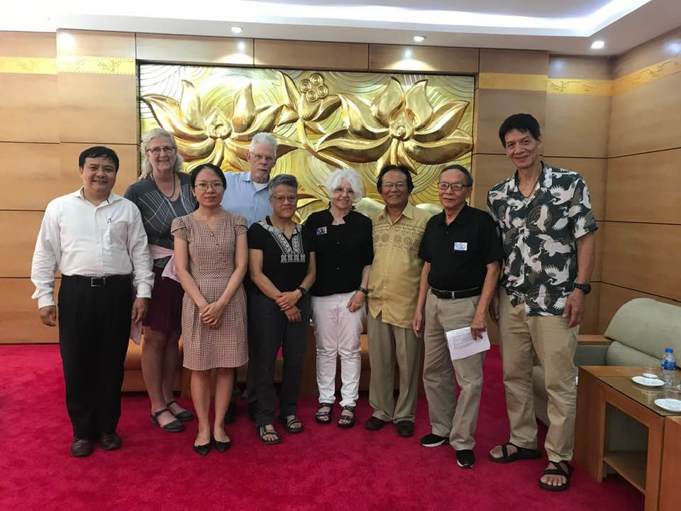 Hanoi has changed since I was there in 2013; it’s more cosmopolitan & is dotted with huge construction projects, built and financed I believe by Japanese business interests. Picture 1 is a ceremony at Hoa Lo prison where McCain was kept. I and others presented anti-war memorabilia for the prison’s archives. The government goal now, as I picked it up, is peace and reconciliation on all sides. The man in the blue shirt fought at Tet; behind me is a Confucian scholar coming home. Below is our delegation with Ambassador Chien in the yellow shirt, president of the Vietnam USA Society. At our lunch, it was clear to me the Ambassador had absorbed the art of toasting in his long service in Russia. And the USA. The pics at the end are of the infamous Hanoi Hilton and a gentle former pilot, last name Chenowith, who was imprisoned there and is now profoundly anti-war. MY FIRST IMPRESSIONS? Our activism against the war is truly appreciated and honored. Now the Vietnamese seek comprehensive partnerships with other nations to continue their economic expansion. Is this a contradiction? Stay tuned.